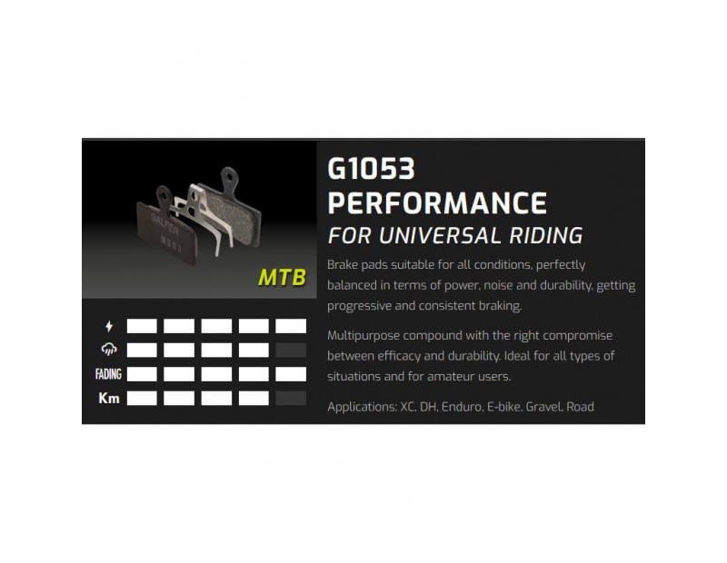 Черните спирачни накладки Performance са предназначени за използване в крос кънтри и ендуро. Те се характеризират с отлична издръжливост и се отличават в дисциплините устойчивост на износване и спирачна сила. Благодарение на високата си устойчивост, калта и мръсотията не им пречат.